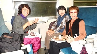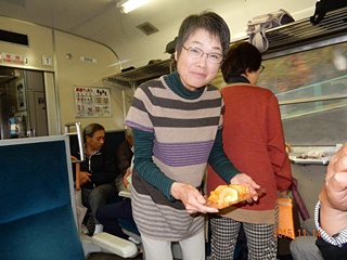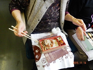 わたらせ渓谷鉄道では紅葉見物はさておき早速アルコールを傾け賑やかのこと。あらかじめ予約していた「やまと豚弁当」「トロッコ弁当」を広げちょっと早めの昼食です。