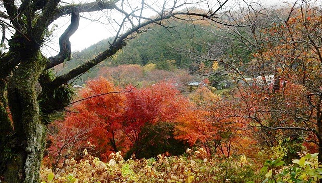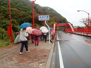小雨降る中、真っ赤な高津戸橋を渡って高津戸峡散策です。暖冬の影響とかであちこちに真っ赤な紅葉や、黄色の木々が垣間見える程度でしたが濡れるほどではない小雨が葉色を際立たせていました。
