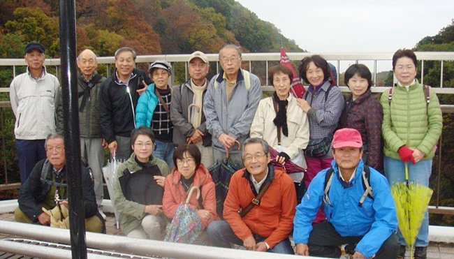階段に喘ぎながら上った絶好の撮影ポイントである「はねたき橋」からの集合写真でしたが、バックが写っていません(残念)。