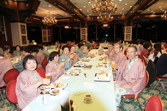 源泉かけ流しの温泉の気分は最高。おいしいグルメをたくさん味わい、夜遅くまで自慢ののどを披露しあいました。