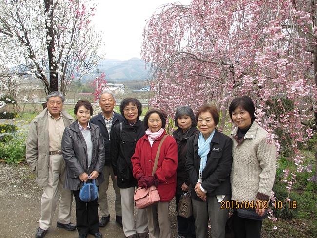 ・翌朝は二日酔いもなく早朝から温泉に浸かり、普段よりも旺盛な食欲でバイキング朝食、そして天候の回復した長瀞への道々では、一本の木に挿し木で混在する紅白の枝垂れ桜や庭に咲く季節の花を堪能しながら、有名な「法善寺」の境内枝垂れ桜を見学、全員で記念撮影もしました。