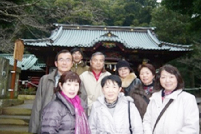 到着後、伊豆山神社に詣でる事に。上がったり下がったりの坂道で相模湾に浮かぶ初島を眺めながらの散策。鳥居をくぐり参道の石段も結構きつかったけれど社殿まで登りきり皆で無事に参拝が出来ました。