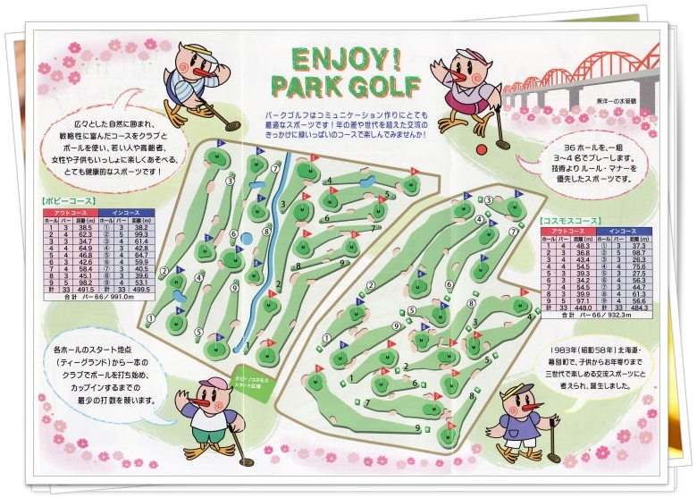 県内のパークゴルフ場は少なく、ここも午前中は団体などがコンペを組み、特に混んでるようです。ポピー、コスモスの2コースがあり、ポピーがやや難しい。