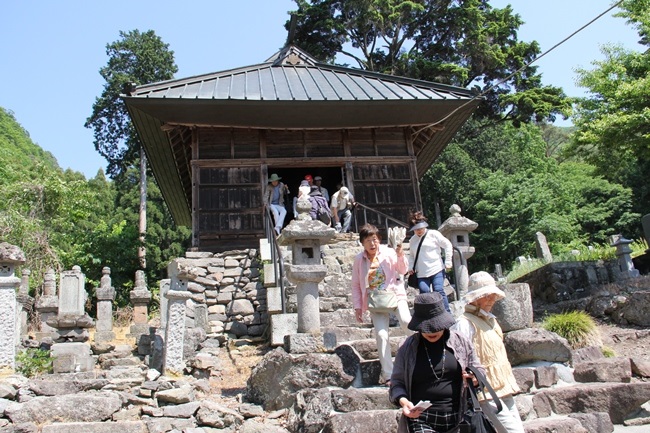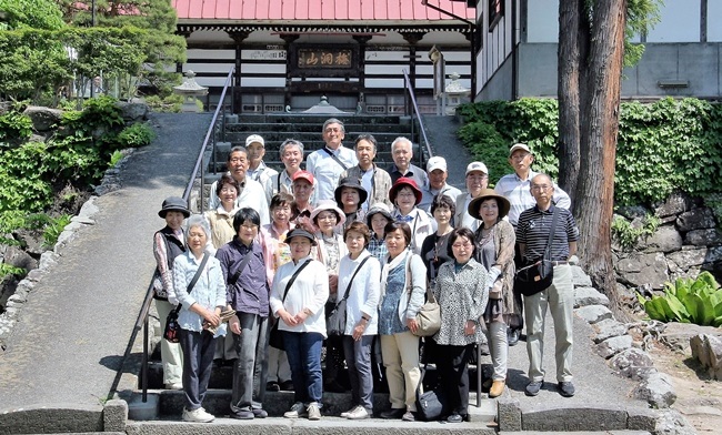 小布施では岩松院で晩年の北斎が描いた21畳の天井絵“鳳凰図”を眺めながら説明を受けた。本堂の裏にある福島正則の霊廟ではなぜこんなところにお墓があるのかと話したりする。