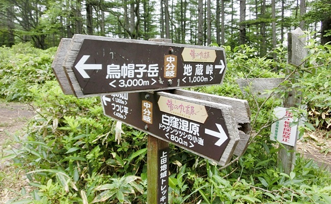 湯の丸高原・地蔵峠(1732m)にバスは到着、「熊・出没情報」の看板に緊張しつつ登山開始です。