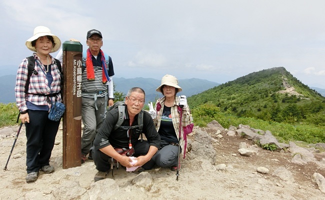 遠景は薄もやでしたが360°の展望を楽しめました。山頂までの登山道にはヤマオダマキ・うすゆきそう・ぐんないふうろ・コマクサ・つるきんばい等高山植物が、また下りは途中からツツジ平を経由しスキー場ゲレンデを歩き、レンゲツツジ・あやめの花も見られ、花と眺望を満喫できた夏の山歩きでした。