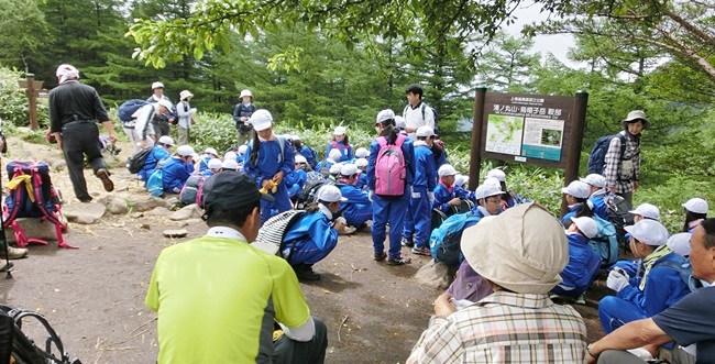 上田市内の小学生グループと相前後しつつの登山となりました。地蔵峠からキャンプ場・カラマツ林のゆるい登りを約1時間で湯の丸山分岐(鞍部)で一休み、灌木とササの道を抜け、草原の中を登ると小烏帽子岳に到着、正面に烏帽子岳・右手に湯の丸山の眺望。岩礫の尾根から大岩の積み重なりを越えると烏帽子岳に到着です。