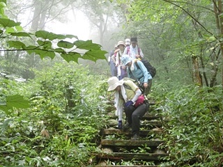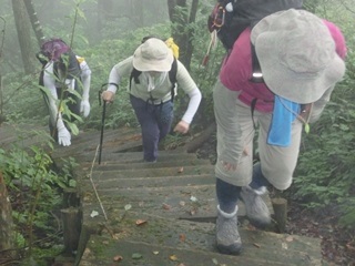 前日までの長雨で木段が水に濡れ、滑り易い状況が続いたため、雨も降り出し危険と判断して下山することに決定しました。(20分登る)