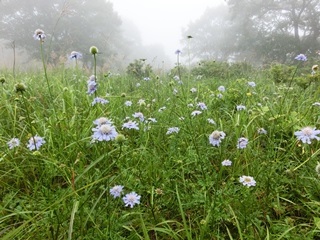 「ゆうすげの道」に入ると、マツムシソウ・吾亦紅・オミナエシ・アザミ・ハギ等秋の花が咲き誇り、又、ゆうすげの花もチラホラと残っており、雨の中でのハイキングでしたが皆さん満足の様子でした。