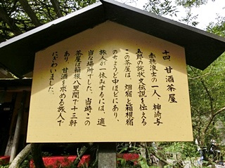 ここ「甘酒茶屋」は江戸初期創業で400年の伝統を守り、現在の当主は13代目とのこと。自家製甘酒(400円)はまさに絶品、その他「力餅(いそべ)」「黒ゴマきなこ餅」も評判です。甘酒・昼食で、ここまでの疲れも解消されました。