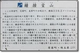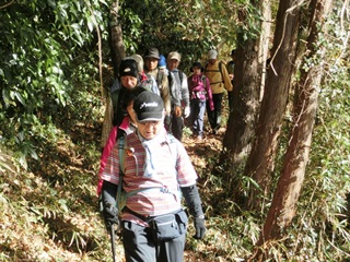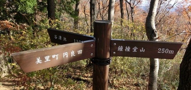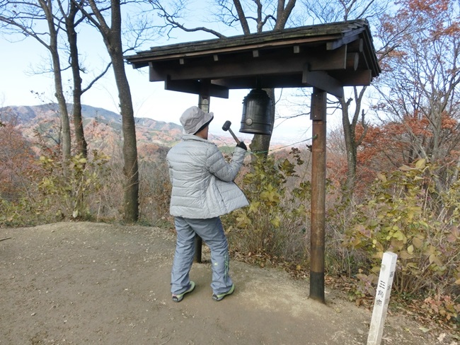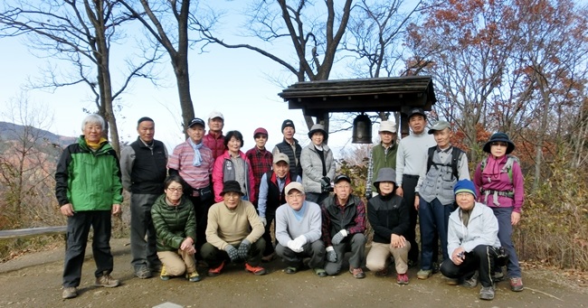 途中、大正池周辺では遅い紅葉が楽しめました。山道は落葉を踏みしめての登り道です。うっそうとした竹林を過ぎると間もなく鐘撞堂山山頂に。戦国時代、荒川の対岸にあった鉢形城の見張り場として、山頂には往時を偲ぶ鐘が置かれています。展望台からは眼下に寄居の町並みから東松山方面が、北側には上州の山並みが見渡せました