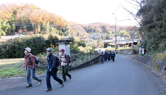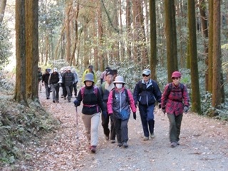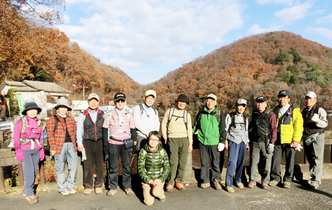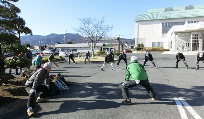 冬のハイキングは霜や積雪等でコース設定が難しくなります。初冬からの身近な山歩きとして大変人気が高い寄居・鐘撞堂山を今回歩きました。寄居駅前に19名が集合し、寄居町役場の中庭で準備体操をして出発です。