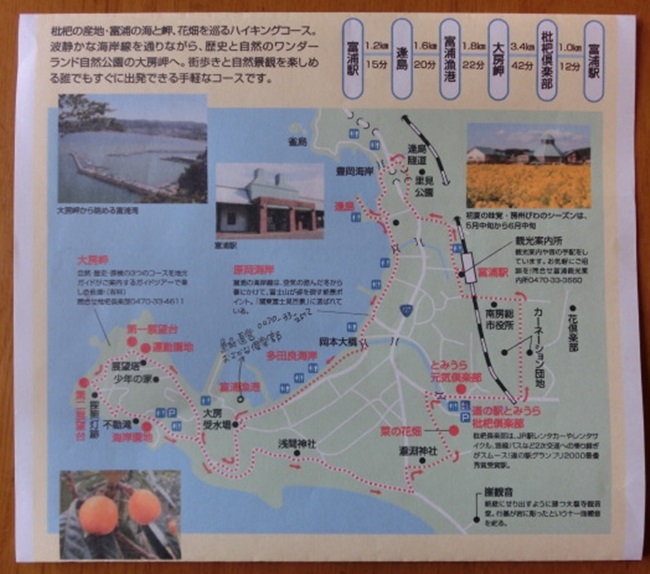今回は、熊谷からバス利用の行程です。JR富浦駅前~豊岡海岸~多田良海岸~富浦漁港~大房岬を一周して「道の駅とみうら」まで海辺を歩き、岬の坂道を上り下り(少しきついところあり)、昔の要塞跡や周囲の風光等を見ながらのハイキングでした。