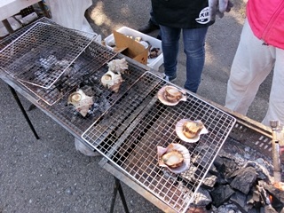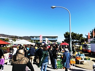 この日、大磯漁港で「おさかな朝市」が開催されているとのこと、まずは見学に。あいにく、海が荒れているため漁は中止でしたが、港では市内のお店や・バザーの出店で賑やかに開かれていました。
