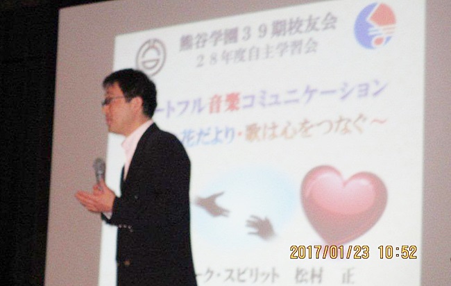 開会セレモニー後の第一部講演として、本庄市を中心として活躍中の「ユニークスピリット・松村正先生」による『ハートフル音楽コミュニケーション~北の花便り・歌は心をつなぐ』の熱演。