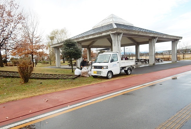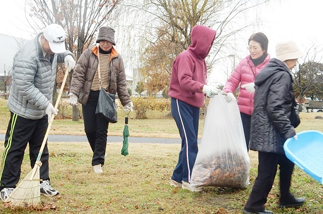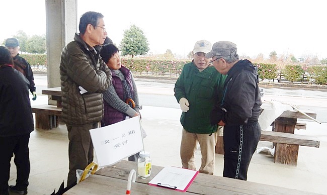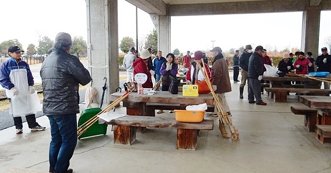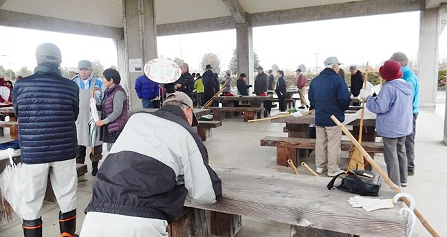 朝方まで雨が降っており、心配しておりましたが、8時頃にはポツポツで半信半疑に花ボラに出かけました、ところが皆さん今年最後の花ボラ作業でもあり、長靴持参での(落葉清掃)に106名の参加者がありました。