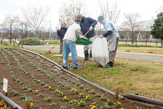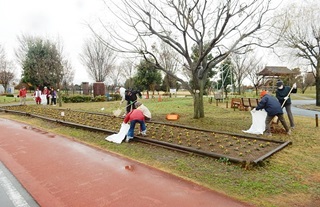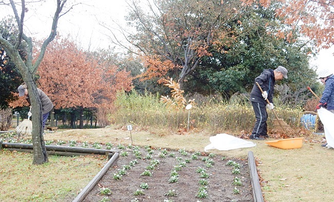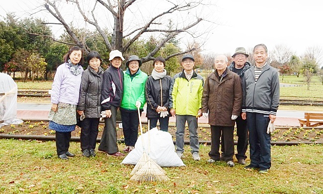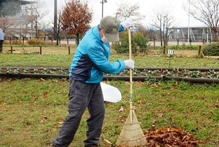 熊手・竹ぼうき・軍手・ビニール袋を用意して頂き、一斉に花壇清掃に入ります、手際の上手さに驚きです。