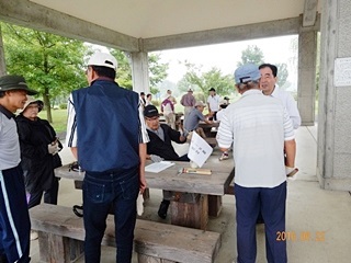 (恒例のラジオ体操) (なんと、ブロック5は花株無く寂しい草取り)