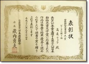 今回は安斉麻里子さんの【日本動物児童文学大賞】及び【アンデルセンのメルヘン文庫・優秀賞受賞】に関し、うれしく思います。