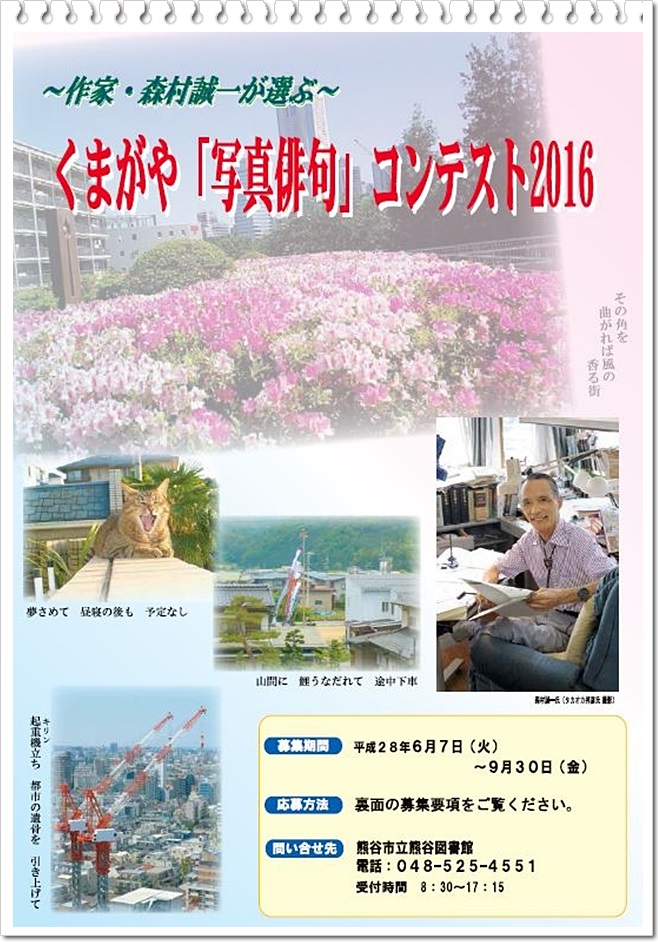 今年も~作家・森村誠一が選ぶ~くまがや「写真俳句」コンテスト2016として実施したところ、北は北海道から南は熊本県まで、下は6歳から上は97歳まで、全国から1275句の投句をいただきました。