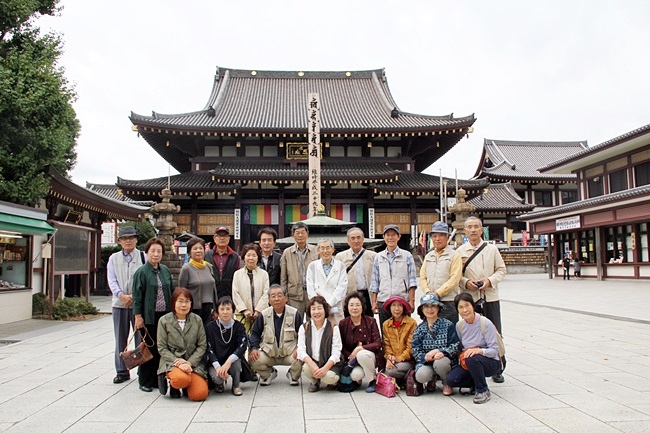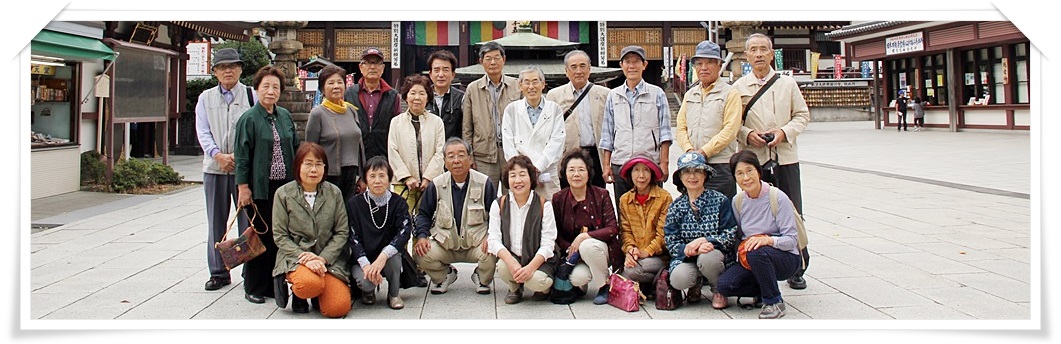 10月4日(金)、33期の史跡巡りの会で今年2回目の活動が計画されました。深谷観光車庫・勤労会館・熊谷市民文化センター前で乗車、20名の参加です。三芳のサービスエリアでトイレ休憩。サービスエリアはきれいで野菜売り場も充実しています。赤カブのきれいな色に思わず買いたくなりますがこれから観光では悪くなってしまうので見るだけ。首都高速を走り東京タワー・スカイツリー・レインボ―ブリッジ・羽田空港など眺めるうちに多摩川を越えるとすぐに川崎大師に到着です。(川崎大師大門前の集合商店街。大得意様の到着だよ!)