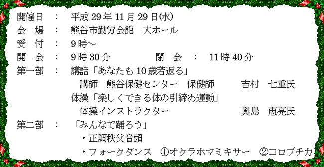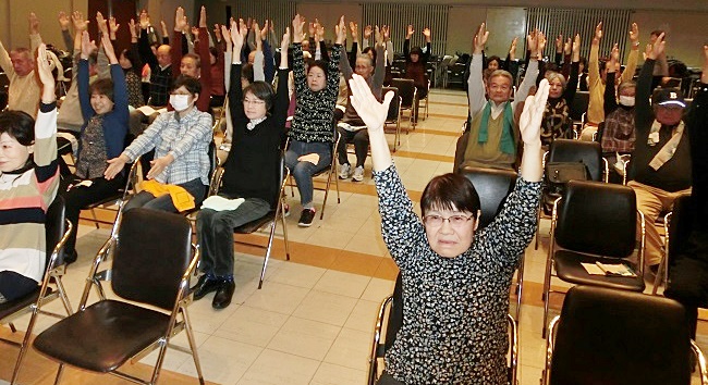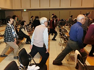 「楽しくできる体の引締め運動」では奧島インストラクターより「若々しい身体を保ち、腰痛・肩こりの予防に効果がある筋力アップ体操やストレッチ運動」の説明・指導を受け、約40分間の体操に汗を流しながらみなさん頑張りました。