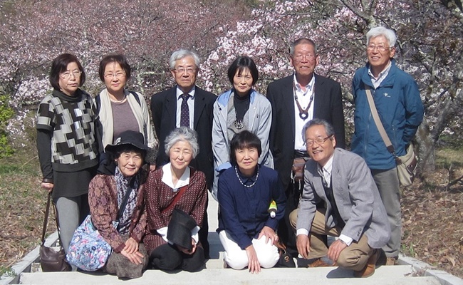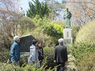 前に進むと植え込みの中に銅像が見えます。秩父音頭を埼玉の代表的民謡として再生させた、金子伊昔紅(いせきこう)です。今年2月20日に逝去された、金子兜太氏の父上と云った方が分かりやすいかと思います。 皆さん、歩くのが億劫なようで、奥へ歩き回らず、花を愛でました。