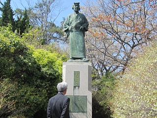 (金子伊昔虹像の前) (像の前で碑文を読み込むTさん)