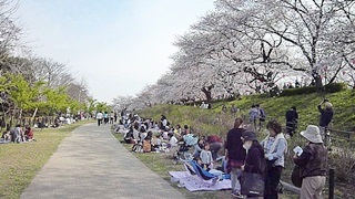 (中央の桜堤から降りた所) (堤の下の遊歩道から眺めた桜が素晴らしい)