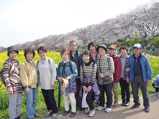 街道の面影のある町並みを歩き権現堂堤を目指して歩きました。堤の桜は9分咲きでしたが先ずシートを敷いて桜を眺めながらお花見です。