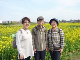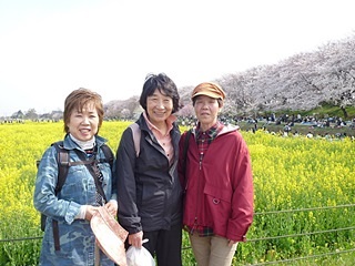 のんびりお弁当の後、菜の花畑を歩きました、堤の桜の淡いピンク色と広大な菜の花畑の鮮やかな黄色のコントラストが素晴らしくて感動しました。