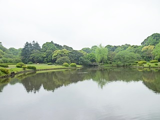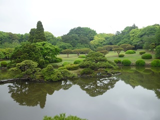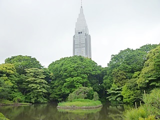 間もなく池泉回遊式の日本庭園に来ました、池には鯉が泳ぎ、池と森が調和した美しい庭園です。森の向こうの高層ビルは,NTTドコモビル電波塔(通称:代々木ビル)です。