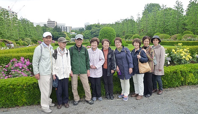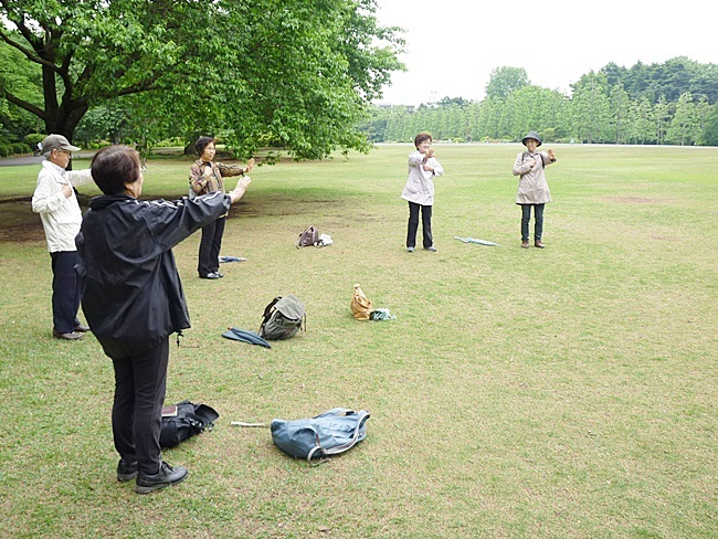 次に広大な芝生広場が中心のイギリス風景式庭園に入り、芝生の上で平久井さんの指導で、指先体操で手先をほぐしました(ハイ、1.2.3.4・・・)ボケ防止です。