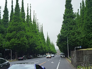 車道の両脇に二重に四列の合計146本が植えられており、新緑は凄く綺麗でした。新緑のイチョウ並木を歩きます。