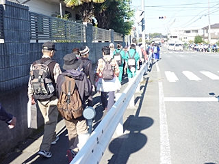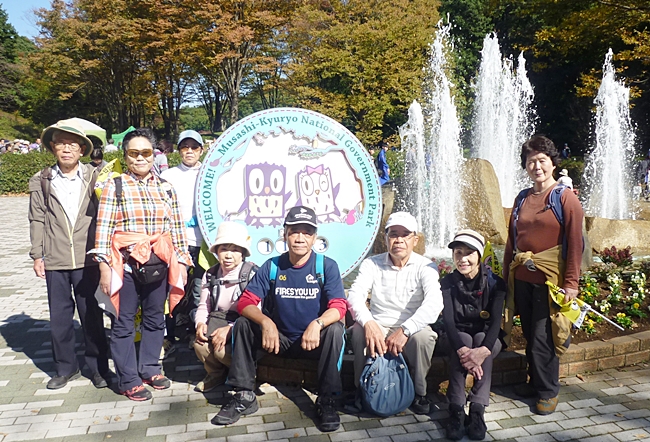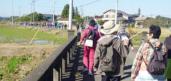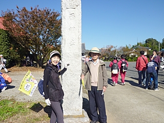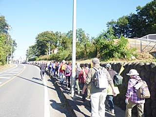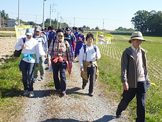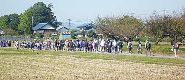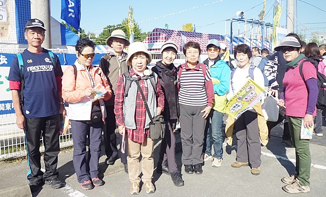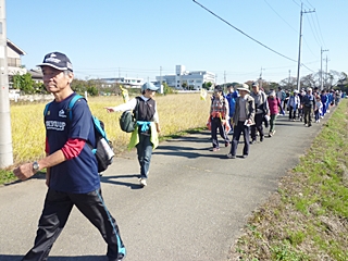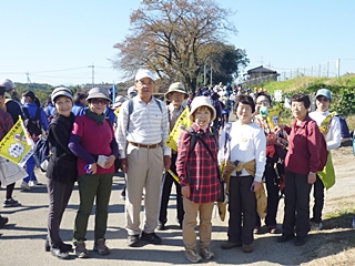 中央会場(東松山市役所)に9時に集合して歩き出しました。歩く前に記念写真です、秋晴れの恵まれ絶好の歩き日和です。