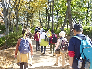歩き出して1時間30分過ぎの緑の丘陵の森林公園が目に入って来ました、綺麗に紅葉した樹木が私達を迎えてくれました。