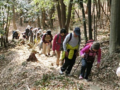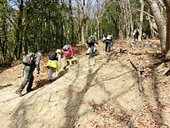 車道をしばらく進んでから山道に入ります。滑り易い岩肌の山道、落ち葉にうずもれた山道を登り、更にジグザグの急こう配を一気に登りきると休憩所の建物が目の前に見えてきます。