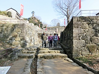 金山(233m)山頂には新田神社や史跡の石碑が立ち、高く積まれた石垣・神聖な池、日ノ池・馬場曲輪・見張り場としての物見台等の遺構を見ながら金龍寺への山道を下りおります。