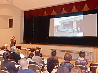 紹介内容は、パワーポイントで傾聴ボランティア養成講座の活動状況、そして傾聴ボランティアに関する講演、最後に養成講座の会員とともに「みんなで踊ろう」を実施した。