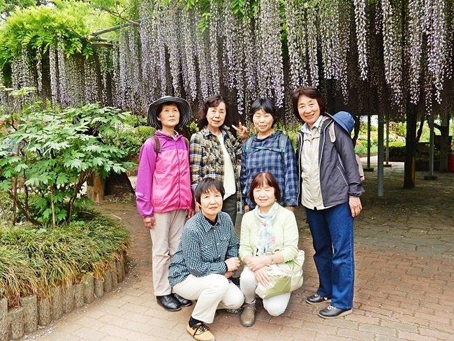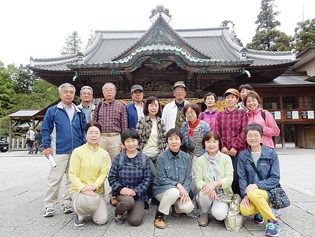 箭弓稲荷神社は、建物の彫刻等には金箔などは無く妻沼の聖天様と比較すると地味な感じであるが、存在感を十分に示している。全員でお参りし、記念写真のあとは、ボタン園で藤の花とつつじを見て後岩殿観音へ。