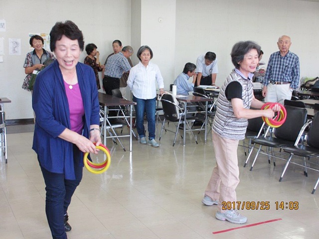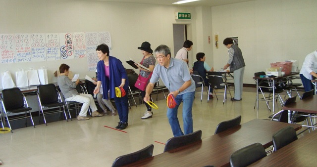 秋彼岸も過ぎて、稲穂も頭を垂れ畔の曼殊沙華とのカラーコントラストも鮮やかな秋の一日、毎月の当番班が「講座や講演会」「オリジナルゲーム」で盛り上げ工夫している中で、今回は【日本輪投げ協会公認の輪投げ】を使って輪投げ個人戦大会を実施しました。