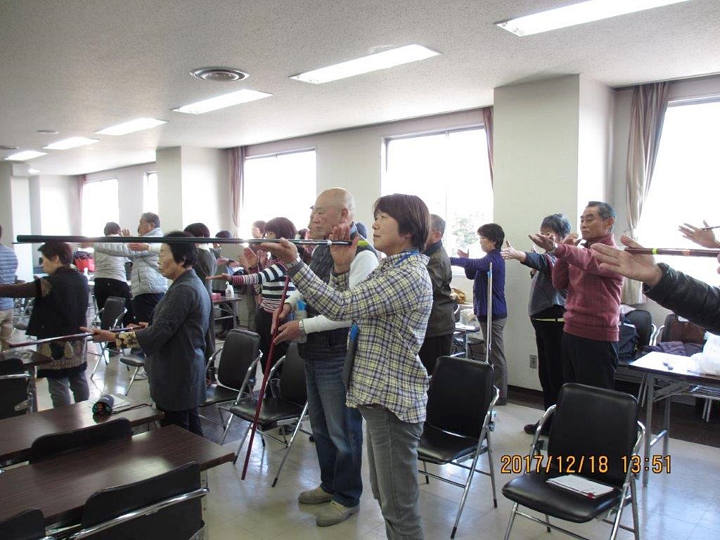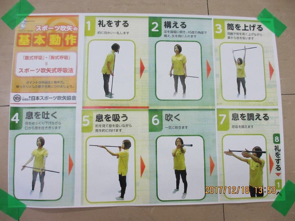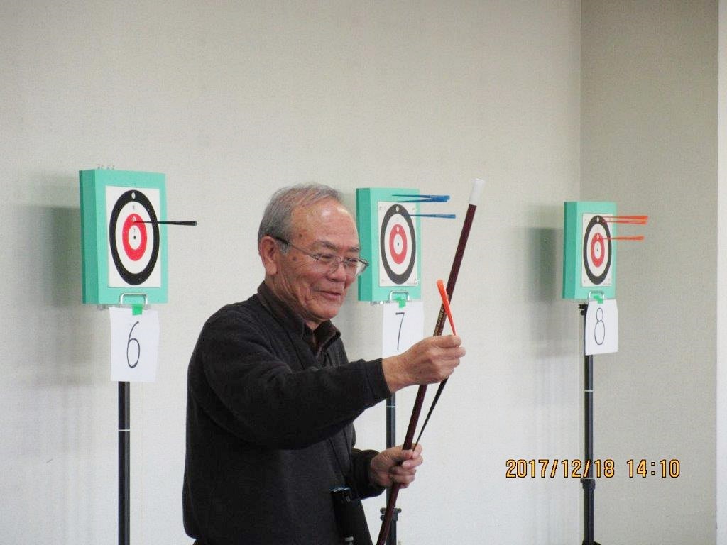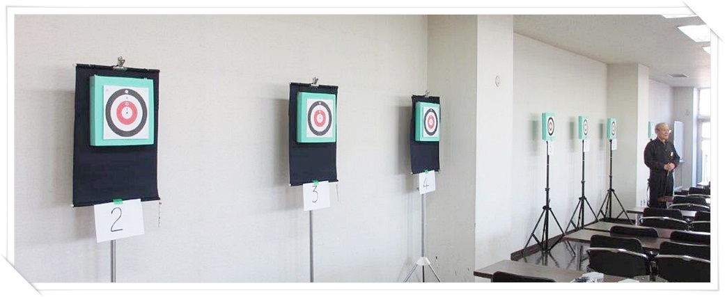 開始の挨拶後、河野さんの指導の下「吹矢の歴史、現状」「吹矢式呼吸法(腹式呼吸)」の説明、筒を持って基本動作(8動作)の練習を行いました。その後、各レーンで5メートル先の標的に試射2発、本射5発を吹き、合わせて2ラウンドの合計得点で順位を競いました。予定時間をオーバーしましたが、スポーツ吹矢体験を無事に終了することができました。