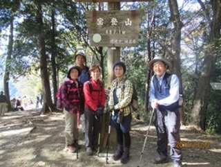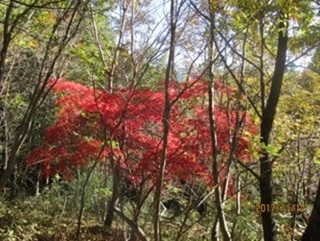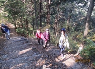 車内はお天気で気分も良く、老老男女が賑やかに会話がはずんでいました。そうこうしているうちに電車は野上に到着。今回の参加者は5名と少なかったですが、予定通り野上駅前を9時40分にスタート。万福寺を通り、スッキリと晴れ渡った青空を見、そして紅葉を見ながらコナラの森から野上峠へと途中に休憩を挟みながら宝登山手前の難所200段の階段まで辿り着きました。