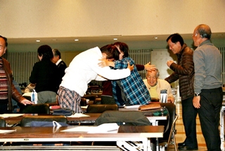 (「笑いヨガ」笑って抱擁)
