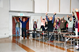 第1部の「笑いヨガ」は、「笑い」に「ヨガの呼吸法」を組み合わせた全く新しい運動法です。腹式呼吸による深呼吸は、健康長寿の秘訣とされています。