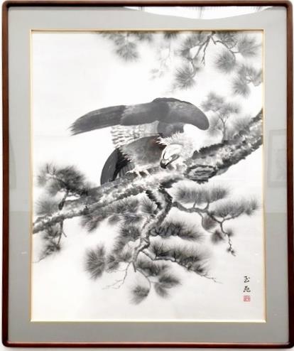 画 題:「狙う」松の枝にとまって獲物を見つけて狩りをする寸前の鷹を描きました。
