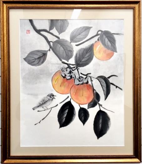 画 題:「晩秋」11月上旬の赤く色づいた柿を狙っている雀を描きました。