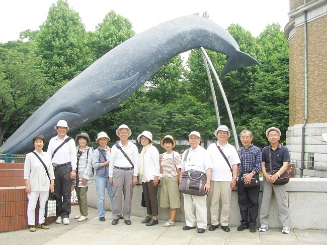 (科学博物館前のシロナガスクジラモニュメント前にて)