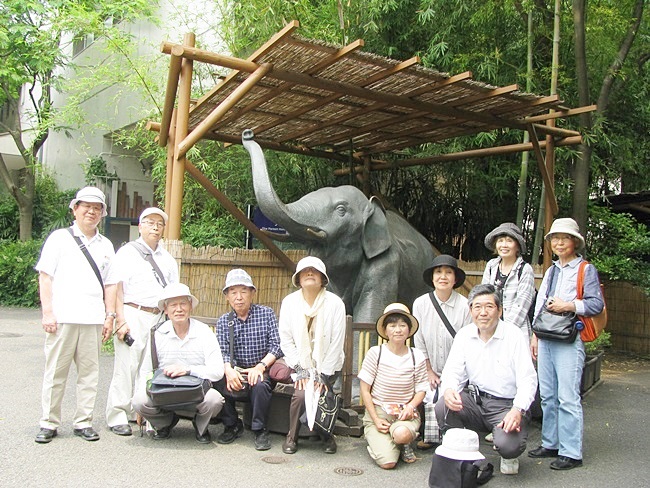 3頭のゾウさんを見て、オブジェの前で、記念写真。