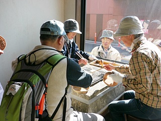 今日の楽しみのひとつに煎餅焼きの体験がありました。3人で座り係の指導を受けて丁寧にオリジナルの煎餅を焼き上げました。食べてみると、やはり手作りはひと味違いました。